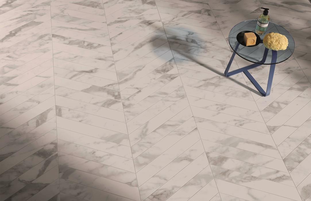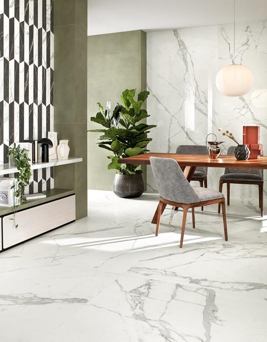 Du côté des finitions, un carrelage effet marbre poli brillant vient accentuer la tonalité luxueuse du matériau et illumine une pièce. Le fini mat, quant à lui, délivre une touche plus contemporaine et feutrée.