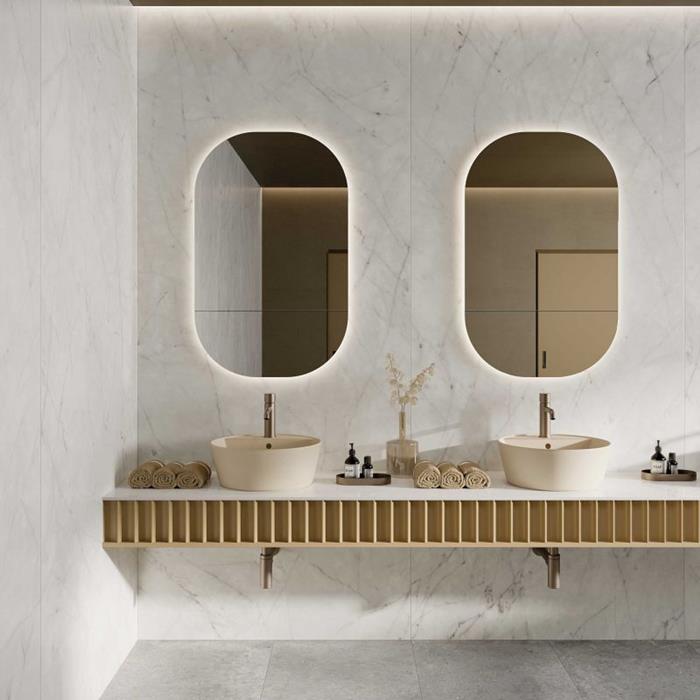 - Marbre de Carrare, blanc et veiné de gris, pour une ambiance pure et lumineuse.