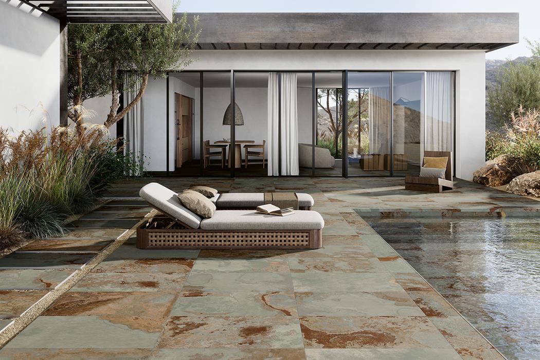 Résistants au gel, aux UV et aux intempéries, certains modèles de carrelage effet pierre sont conçus pour une pose en extérieur. Terrasses, plages de piscine ou allées de jardin : ils offrent aux espaces un large panel d’ambiances.